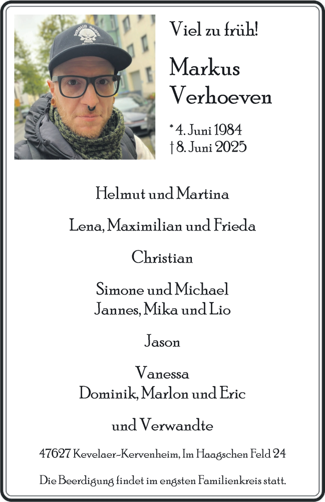 Hier finden Sie alle Traueranzeigen aus der Zeitung, die bisher für Markus Verhoeven erschienen sind. Weitere Traueranzeigen, die in der Zeitung erscheinen, werden hier ebenfalls aufgelistet