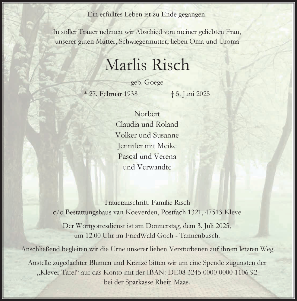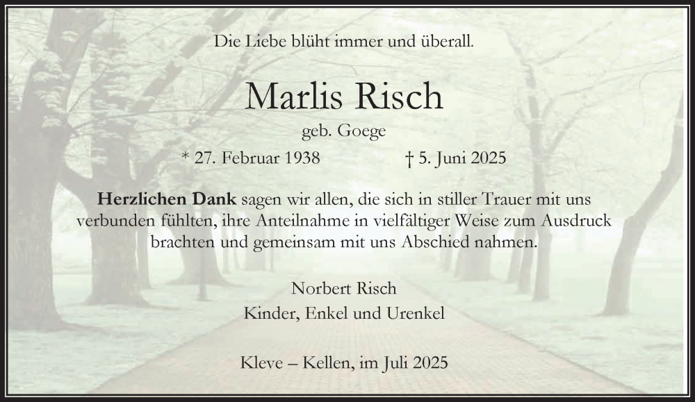 Hier finden Sie alle Traueranzeigen aus der Zeitung, die bisher für Marlis Risch erschienen sind. Weitere Traueranzeigen, die in der Zeitung erscheinen, werden hier ebenfalls aufgelistet