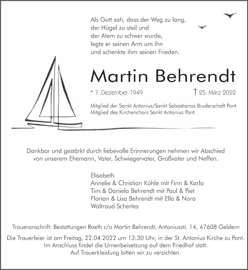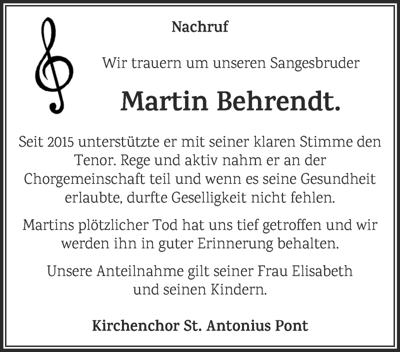 Hier finden Sie alle Traueranzeigen aus der Zeitung, die bisher für Martin Behrendt erschienen sind. Weitere Traueranzeigen, die in der Zeitung erscheinen, werden hier ebenfalls aufgelistet