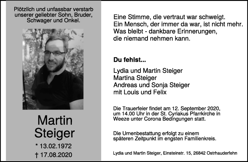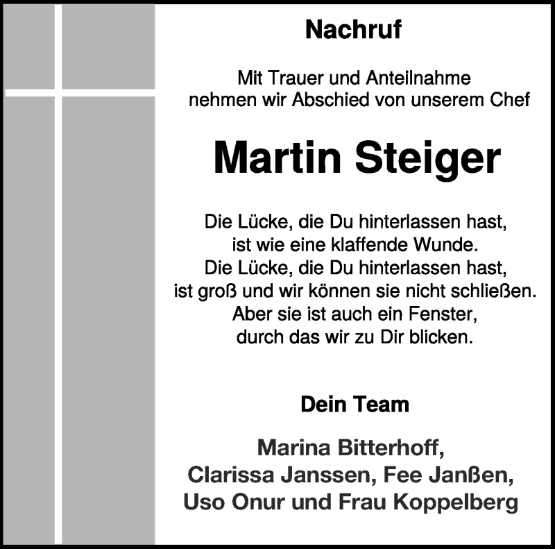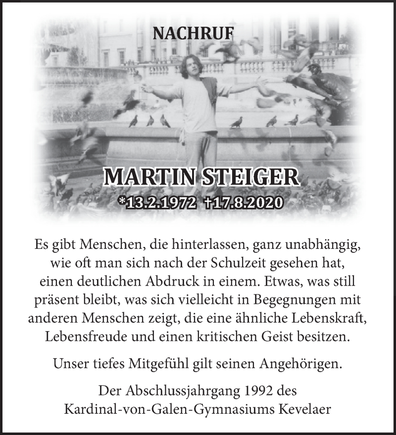 Hier finden Sie alle Traueranzeigen aus der Zeitung, die bisher für Martin Steiger erschienen sind. Weitere Traueranzeigen, die in der Zeitung erscheinen, werden hier ebenfalls aufgelistet