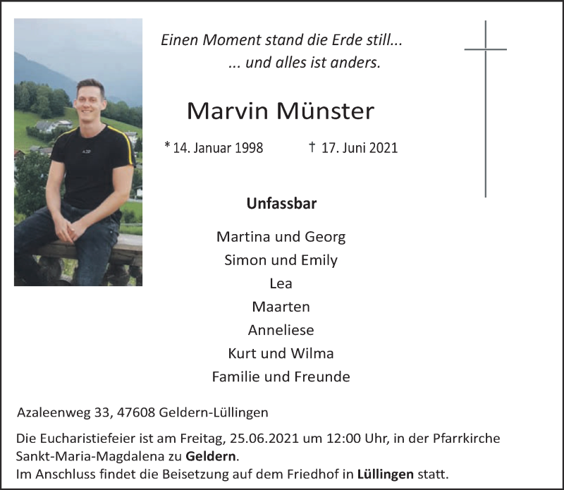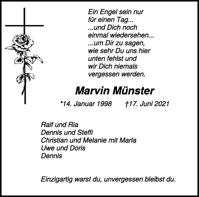 Hier finden Sie alle Traueranzeigen aus der Zeitung, die bisher für Marvin Münster erschienen sind. Weitere Traueranzeigen, die in der Zeitung erscheinen, werden hier ebenfalls aufgelistet