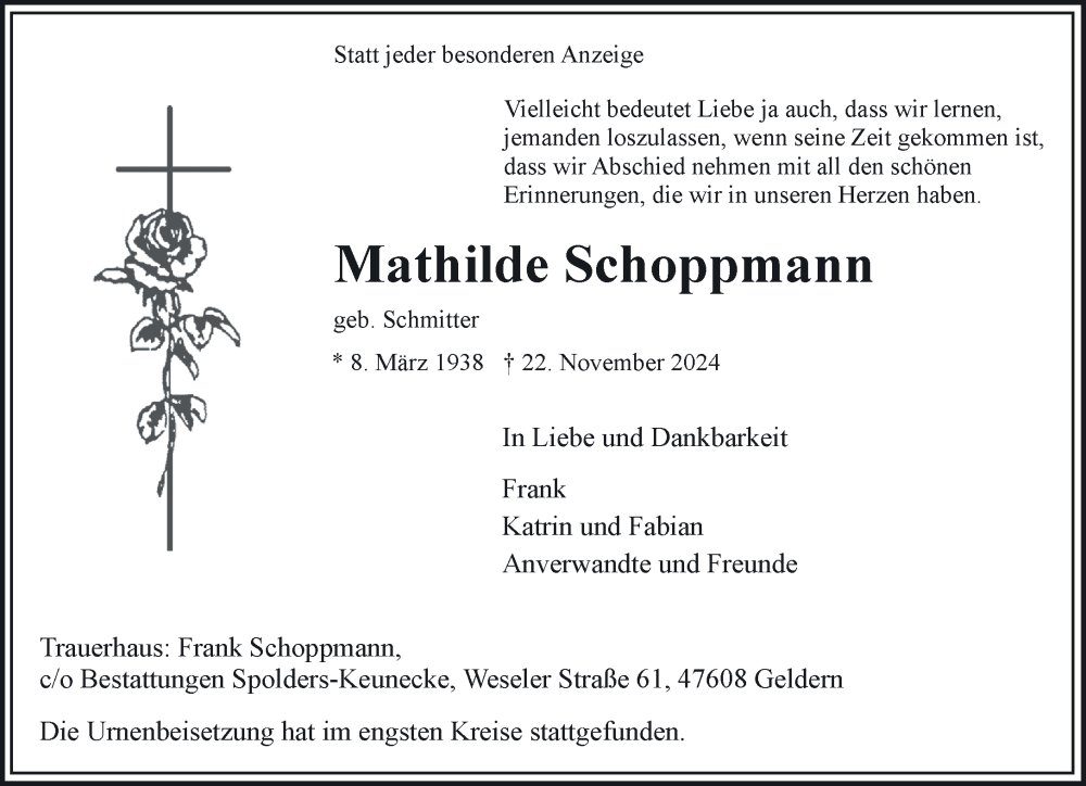 Hier finden Sie alle Traueranzeigen aus der Zeitung, die bisher für Mathilde Schoppmann erschienen sind. Weitere Traueranzeigen, die in der Zeitung erscheinen, werden hier ebenfalls aufgelistet