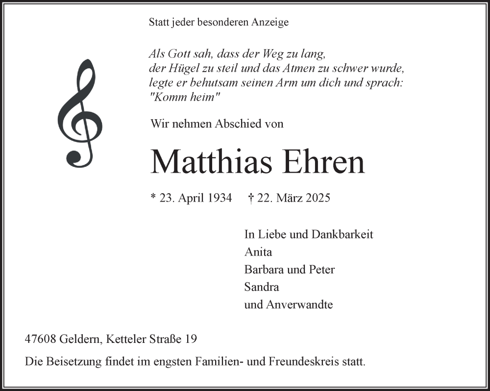 Hier finden Sie alle Traueranzeigen aus der Zeitung, die bisher für Matthias Ehren erschienen sind. Weitere Traueranzeigen, die in der Zeitung erscheinen, werden hier ebenfalls aufgelistet