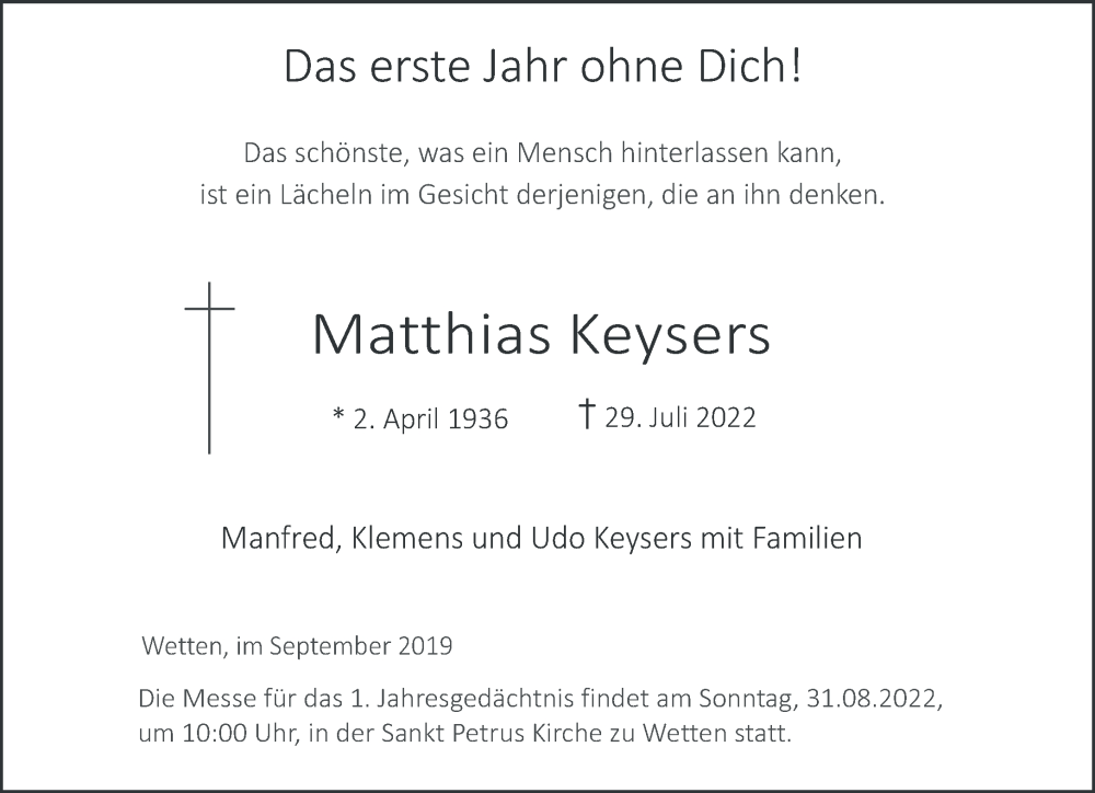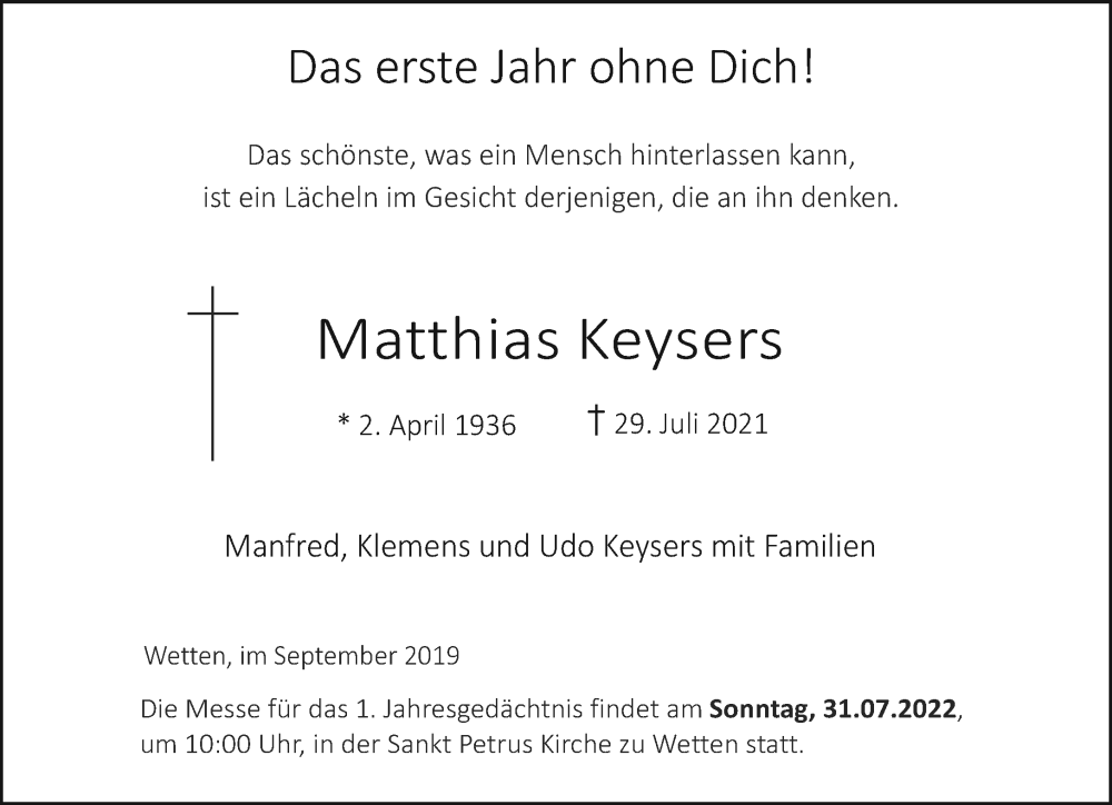 Hier finden Sie alle Traueranzeigen aus der Zeitung, die bisher für Matthias Keysers erschienen sind. Weitere Traueranzeigen, die in der Zeitung erscheinen, werden hier ebenfalls aufgelistet