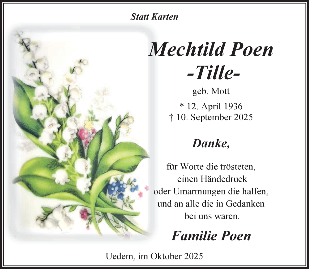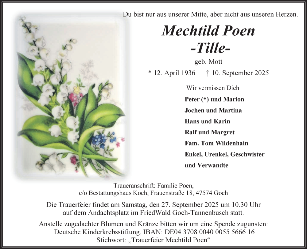 Hier finden Sie alle Traueranzeigen aus der Zeitung, die bisher für Mechtild Poen erschienen sind. Weitere Traueranzeigen, die in der Zeitung erscheinen, werden hier ebenfalls aufgelistet