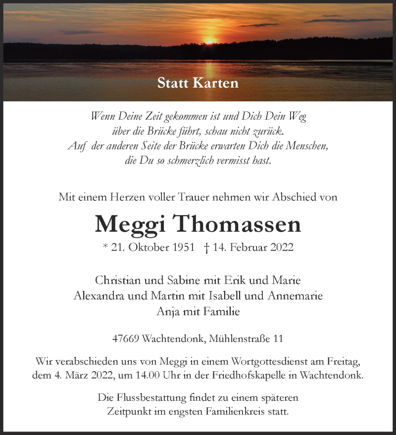 Hier finden Sie alle Traueranzeigen aus der Zeitung, die bisher für Meggi Thomassen erschienen sind. Weitere Traueranzeigen, die in der Zeitung erscheinen, werden hier ebenfalls aufgelistet