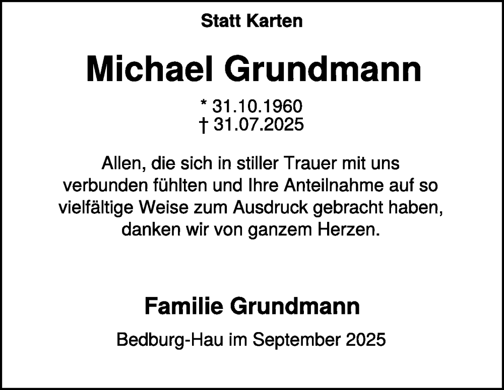 Hier finden Sie alle Traueranzeigen aus der Zeitung, die bisher für Michael Grundmann erschienen sind. Weitere Traueranzeigen, die in der Zeitung erscheinen, werden hier ebenfalls aufgelistet