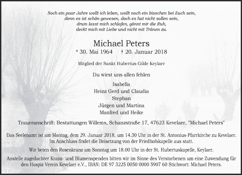 Hier finden Sie alle Traueranzeigen aus der Zeitung, die bisher für Michael Peters erschienen sind. Weitere Traueranzeigen, die in der Zeitung erscheinen, werden hier ebenfalls aufgelistet