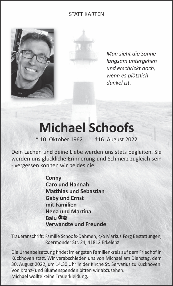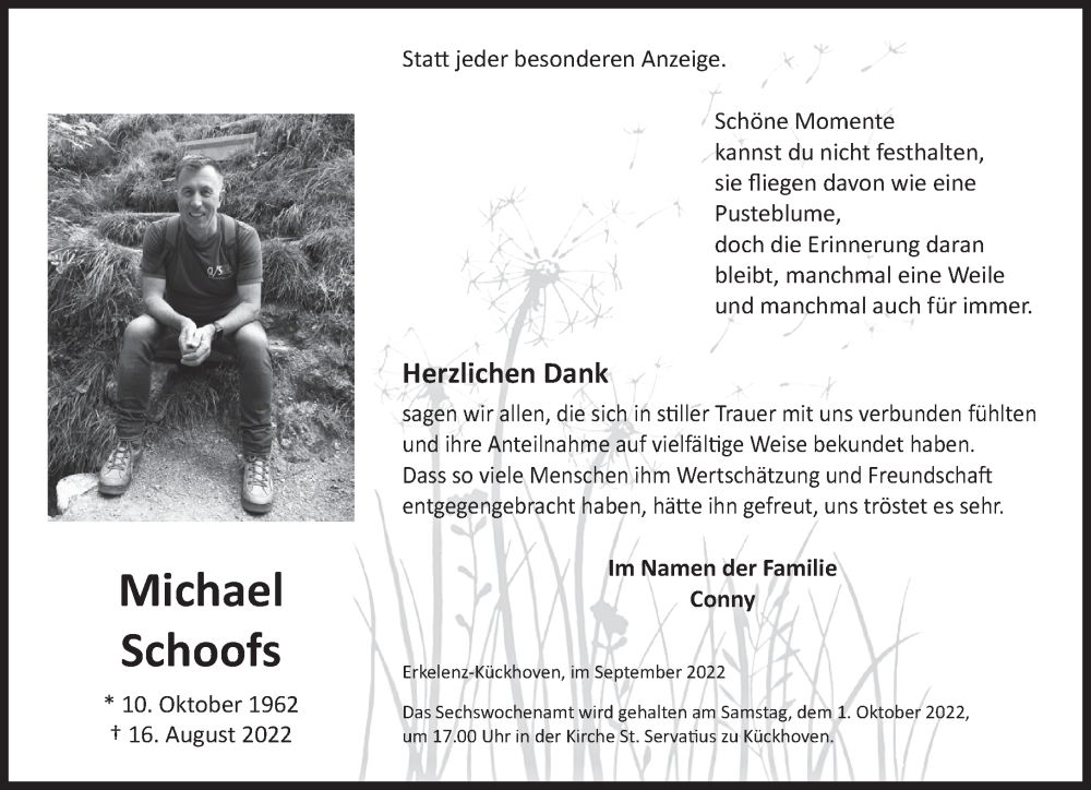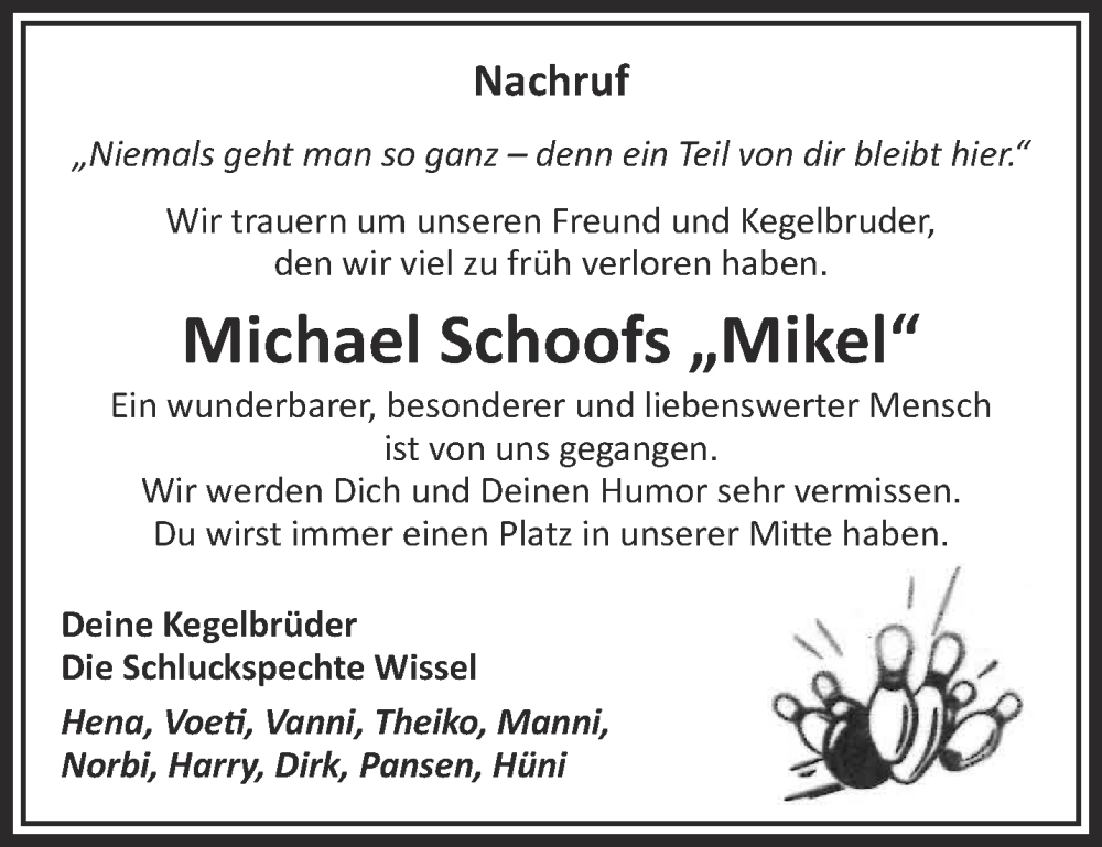 Hier finden Sie alle Traueranzeigen aus der Zeitung, die bisher für Michael Schoofs erschienen sind. Weitere Traueranzeigen, die in der Zeitung erscheinen, werden hier ebenfalls aufgelistet