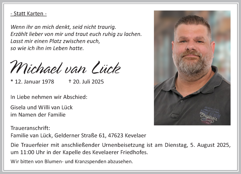 Hier finden Sie alle Traueranzeigen aus der Zeitung, die bisher für Michael van Lück erschienen sind. Weitere Traueranzeigen, die in der Zeitung erscheinen, werden hier ebenfalls aufgelistet