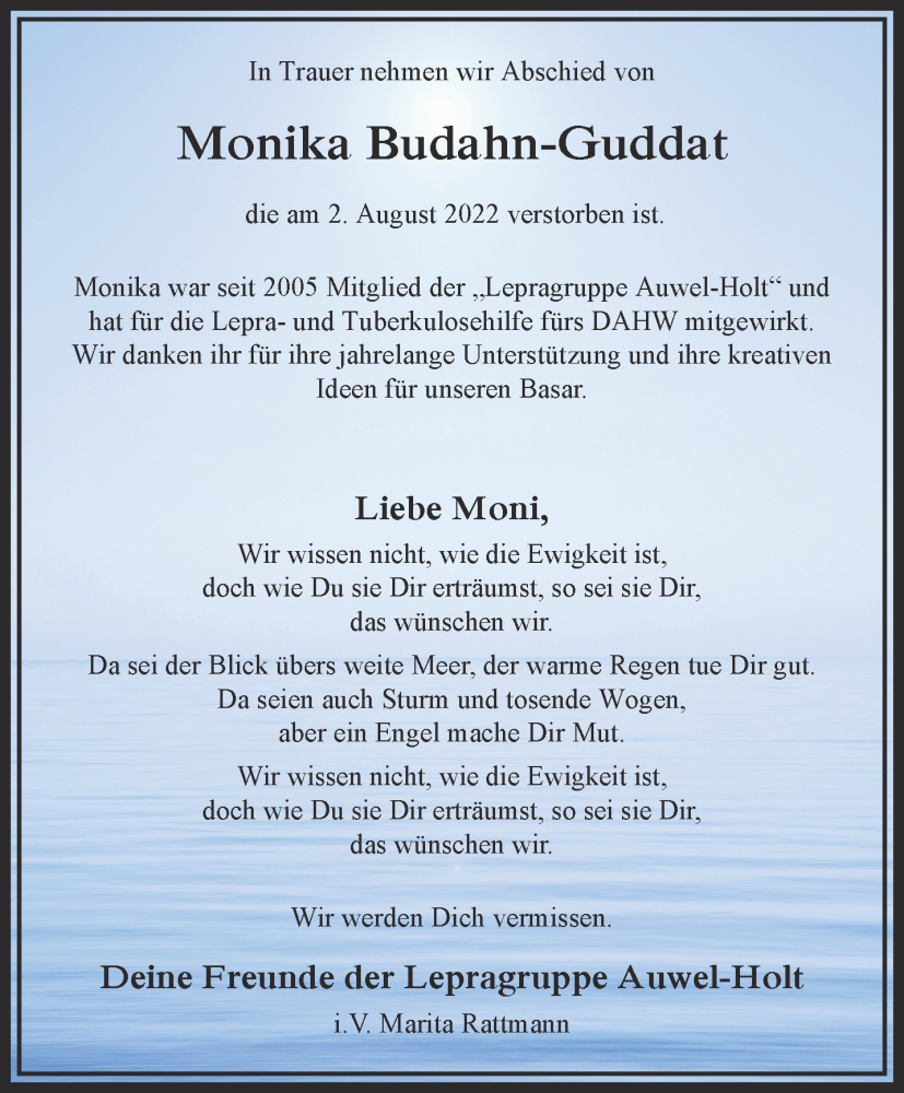 Hier finden Sie alle Traueranzeigen aus der Zeitung, die bisher für Monika Budahn-Guddat erschienen sind. Weitere Traueranzeigen, die in der Zeitung erscheinen, werden hier ebenfalls aufgelistet