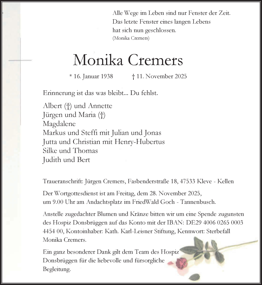 Hier finden Sie alle Traueranzeigen aus der Zeitung, die bisher für Monika Cremers erschienen sind. Weitere Traueranzeigen, die in der Zeitung erscheinen, werden hier ebenfalls aufgelistet