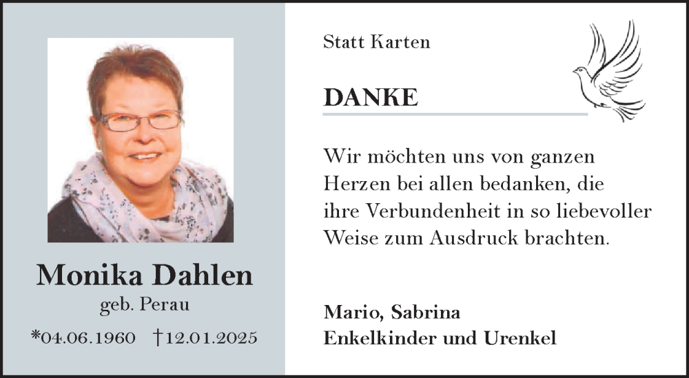 Hier finden Sie alle Traueranzeigen aus der Zeitung, die bisher für Monika Dahlen erschienen sind. Weitere Traueranzeigen, die in der Zeitung erscheinen, werden hier ebenfalls aufgelistet