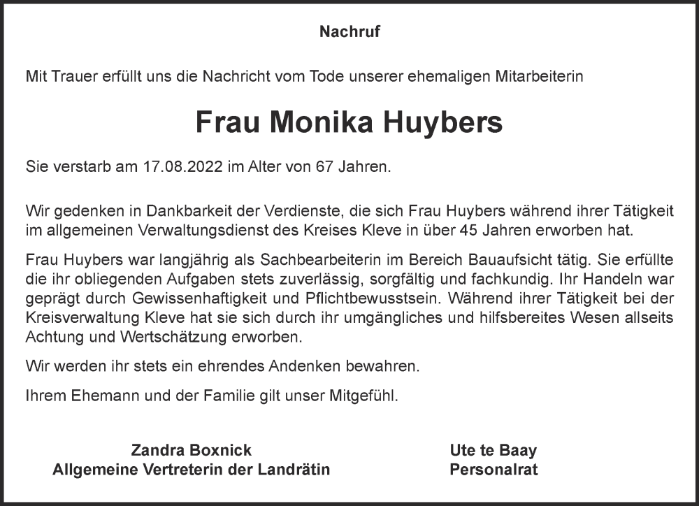 Hier finden Sie alle Traueranzeigen aus der Zeitung, die bisher für Monika Huybers erschienen sind. Weitere Traueranzeigen, die in der Zeitung erscheinen, werden hier ebenfalls aufgelistet