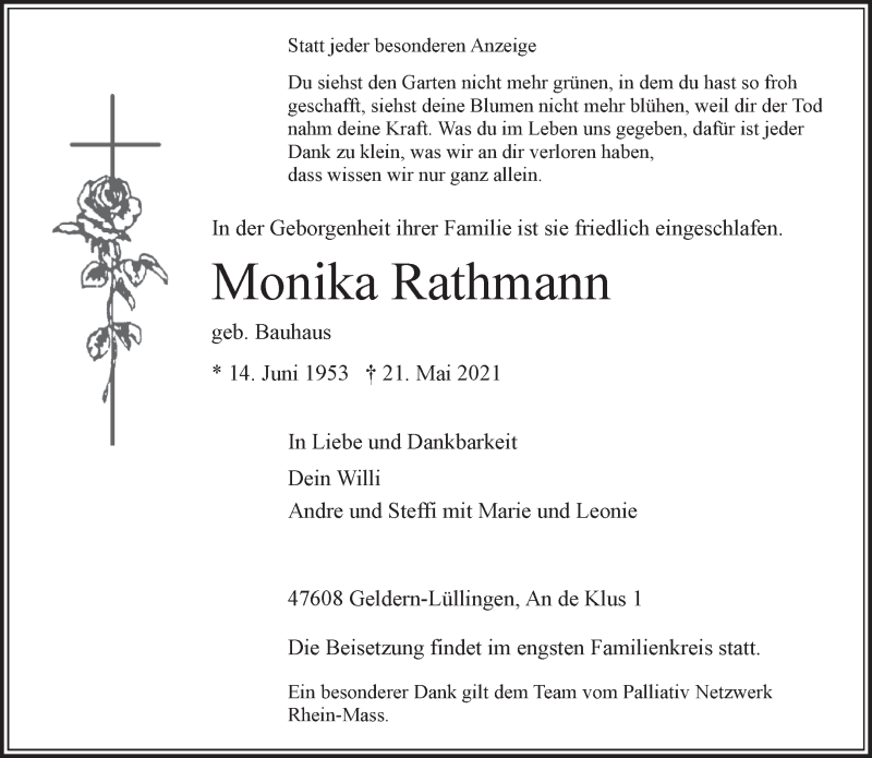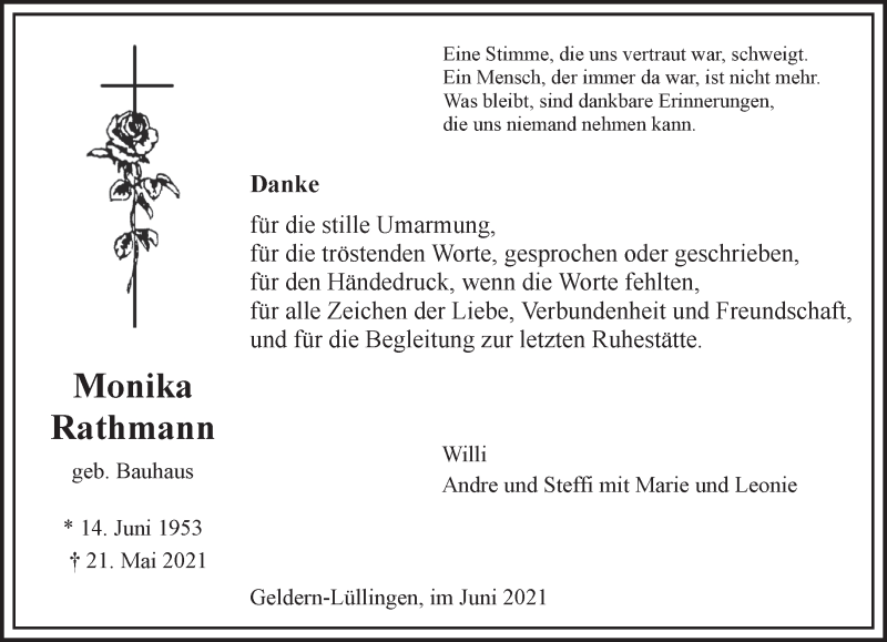 Hier finden Sie alle Traueranzeigen aus der Zeitung, die bisher für Monika Rathmann erschienen sind. Weitere Traueranzeigen, die in der Zeitung erscheinen, werden hier ebenfalls aufgelistet
