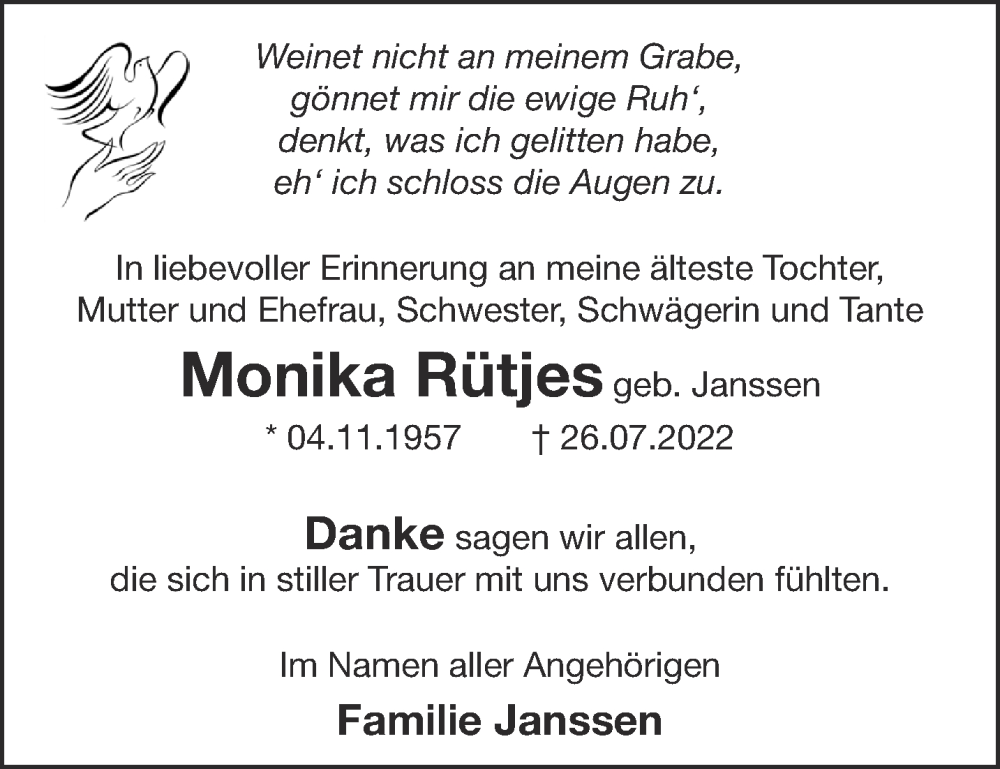Hier finden Sie alle Traueranzeigen aus der Zeitung, die bisher für Monika Rütjes erschienen sind. Weitere Traueranzeigen, die in der Zeitung erscheinen, werden hier ebenfalls aufgelistet