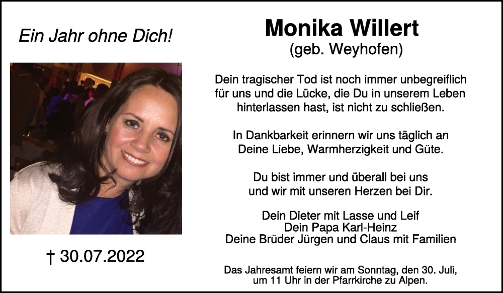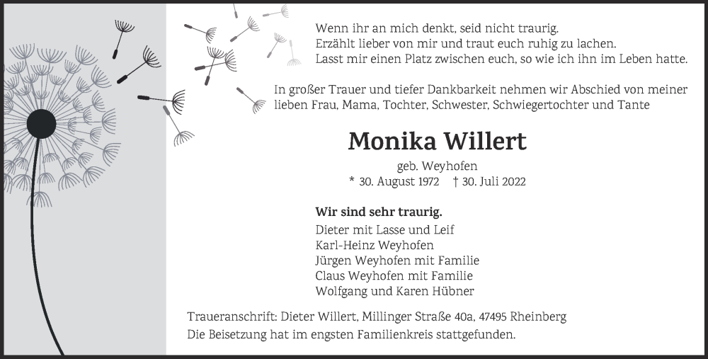Hier finden Sie alle Traueranzeigen aus der Zeitung, die bisher für Monika Willert erschienen sind. Weitere Traueranzeigen, die in der Zeitung erscheinen, werden hier ebenfalls aufgelistet