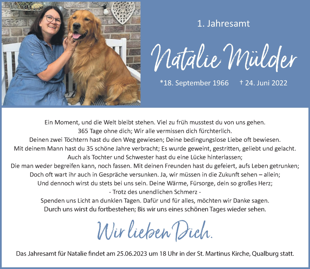 Hier finden Sie alle Traueranzeigen aus der Zeitung, die bisher für Natalie Mülder erschienen sind. Weitere Traueranzeigen, die in der Zeitung erscheinen, werden hier ebenfalls aufgelistet