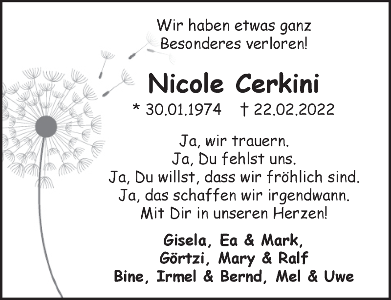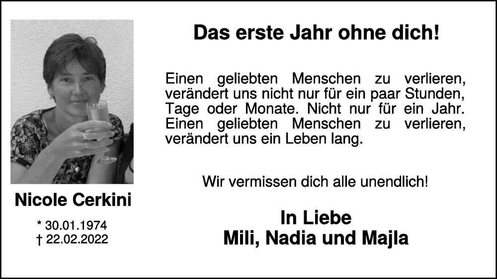 Hier finden Sie alle Traueranzeigen aus der Zeitung, die bisher für Nicole Cerkini erschienen sind. Weitere Traueranzeigen, die in der Zeitung erscheinen, werden hier ebenfalls aufgelistet