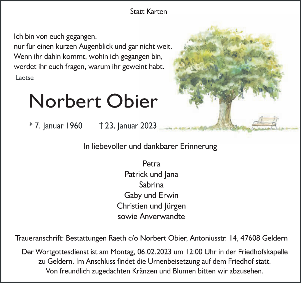 Hier finden Sie alle Traueranzeigen aus der Zeitung, die bisher für Norbert Obier erschienen sind. Weitere Traueranzeigen, die in der Zeitung erscheinen, werden hier ebenfalls aufgelistet