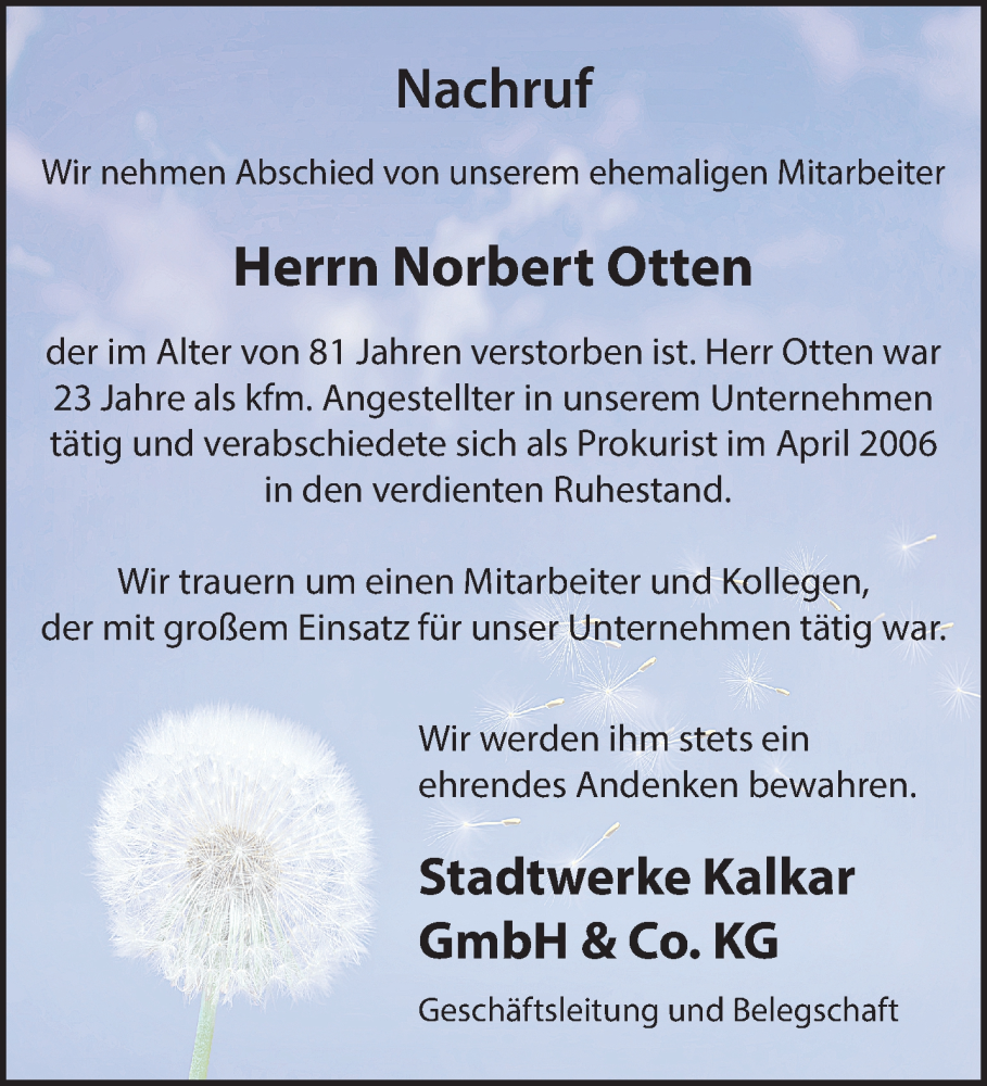 Hier finden Sie alle Traueranzeigen aus der Zeitung, die bisher für Norbert Otten erschienen sind. Weitere Traueranzeigen, die in der Zeitung erscheinen, werden hier ebenfalls aufgelistet