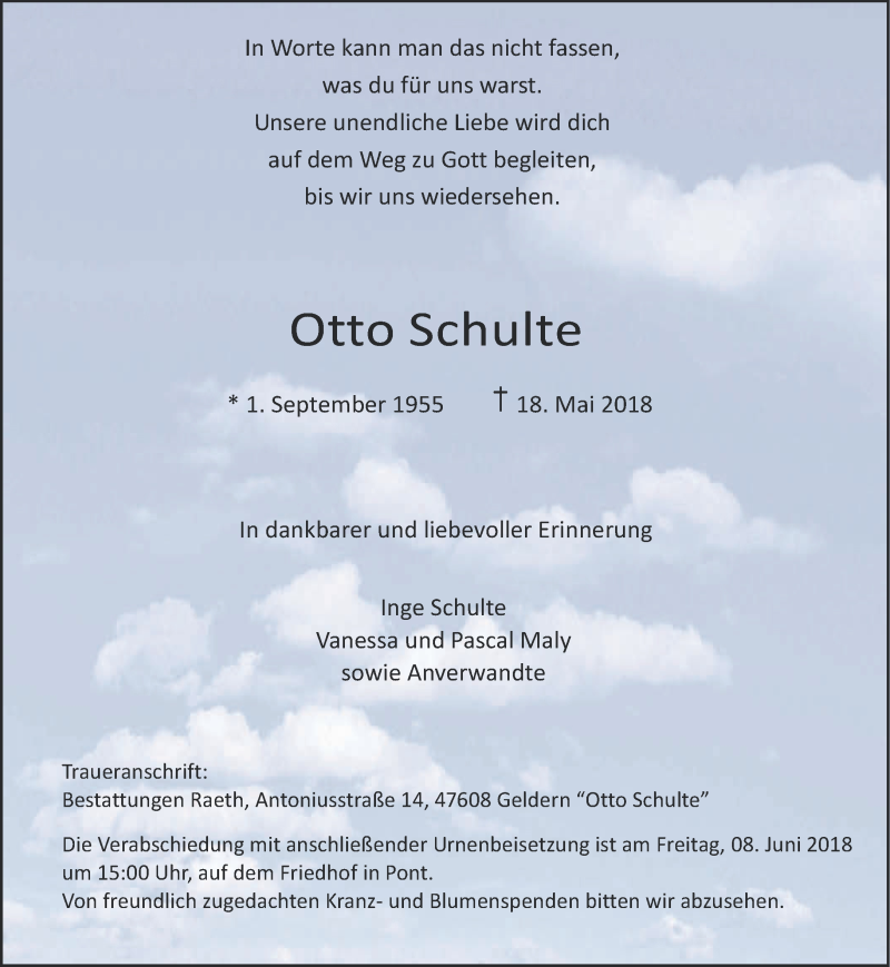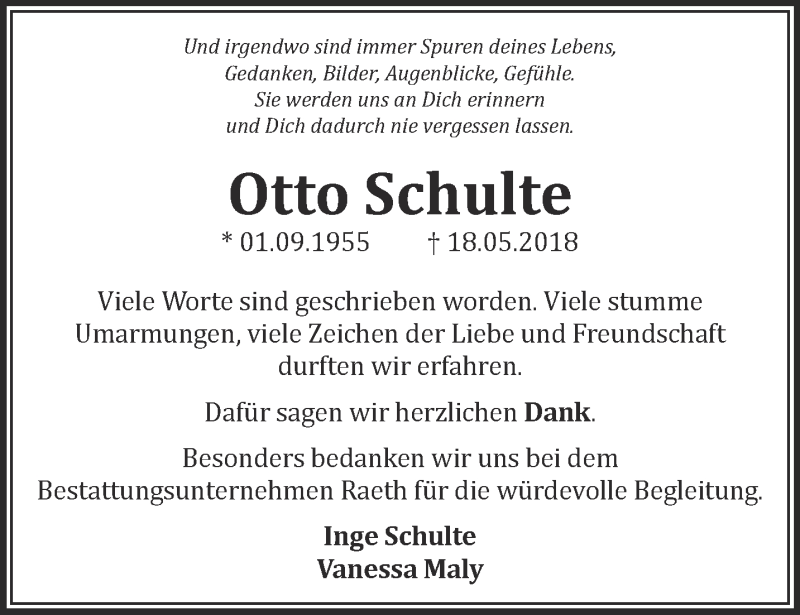 Hier finden Sie alle Traueranzeigen aus der Zeitung, die bisher für Otto Schulte erschienen sind. Weitere Traueranzeigen, die in der Zeitung erscheinen, werden hier ebenfalls aufgelistet