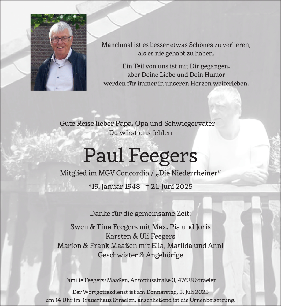 Hier finden Sie alle Traueranzeigen aus der Zeitung, die bisher für Paul Feegers erschienen sind. Weitere Traueranzeigen, die in der Zeitung erscheinen, werden hier ebenfalls aufgelistet