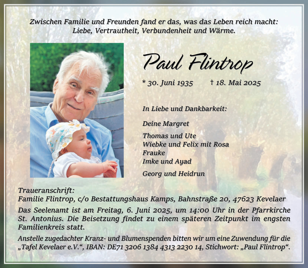 Hier finden Sie alle Traueranzeigen aus der Zeitung, die bisher für Paul Flintrop erschienen sind. Weitere Traueranzeigen, die in der Zeitung erscheinen, werden hier ebenfalls aufgelistet