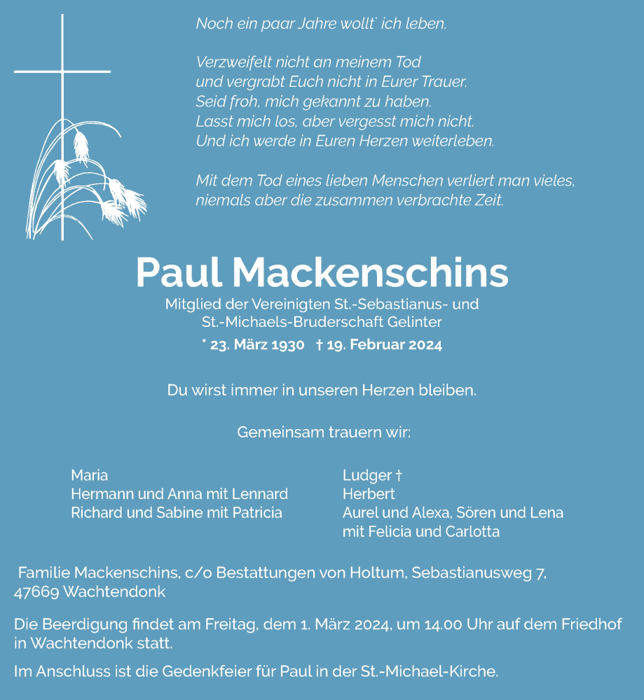 Hier finden Sie alle Traueranzeigen aus der Zeitung, die bisher für Paul Mackenschins erschienen sind. Weitere Traueranzeigen, die in der Zeitung erscheinen, werden hier ebenfalls aufgelistet