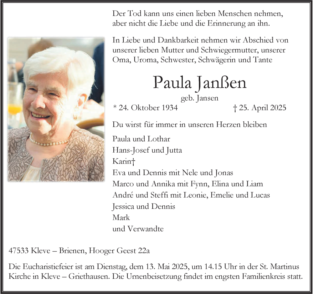 Hier finden Sie alle Traueranzeigen aus der Zeitung, die bisher für Paula Janßen erschienen sind. Weitere Traueranzeigen, die in der Zeitung erscheinen, werden hier ebenfalls aufgelistet