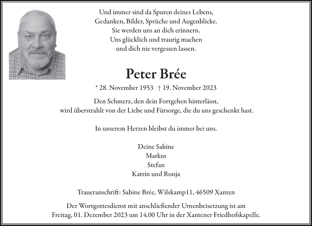 Hier finden Sie alle Traueranzeigen aus der Zeitung, die bisher für Peter Brée erschienen sind. Weitere Traueranzeigen, die in der Zeitung erscheinen, werden hier ebenfalls aufgelistet
