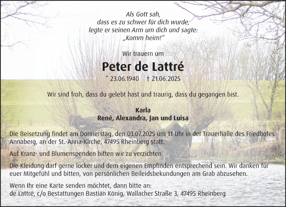 Hier finden Sie alle Traueranzeigen aus der Zeitung, die bisher für Peter de Lattre erschienen sind. Weitere Traueranzeigen, die in der Zeitung erscheinen, werden hier ebenfalls aufgelistet