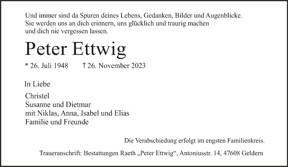 Hier finden Sie alle Traueranzeigen aus der Zeitung, die bisher für Peter Ettwig erschienen sind. Weitere Traueranzeigen, die in der Zeitung erscheinen, werden hier ebenfalls aufgelistet