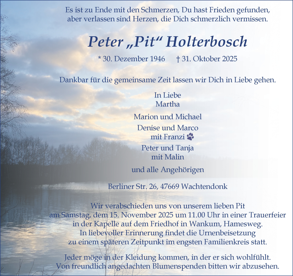 Hier finden Sie alle Traueranzeigen aus der Zeitung, die bisher für Peter Holterbosch erschienen sind. Weitere Traueranzeigen, die in der Zeitung erscheinen, werden hier ebenfalls aufgelistet