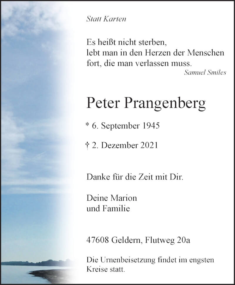 Hier finden Sie alle Traueranzeigen aus der Zeitung, die bisher für Peter Prangenberg erschienen sind. Weitere Traueranzeigen, die in der Zeitung erscheinen, werden hier ebenfalls aufgelistet
