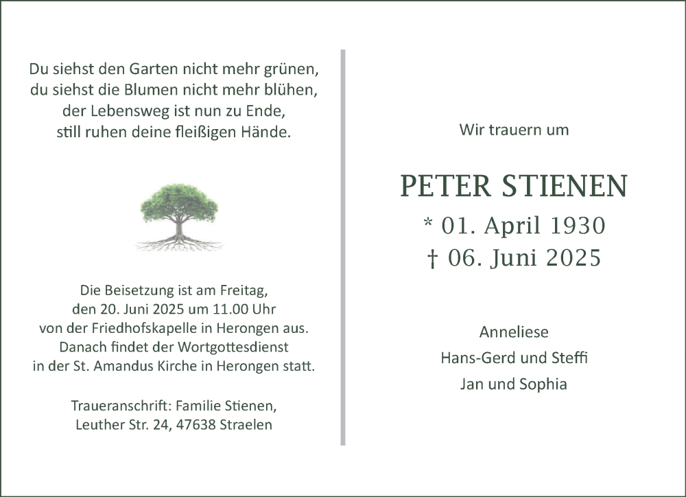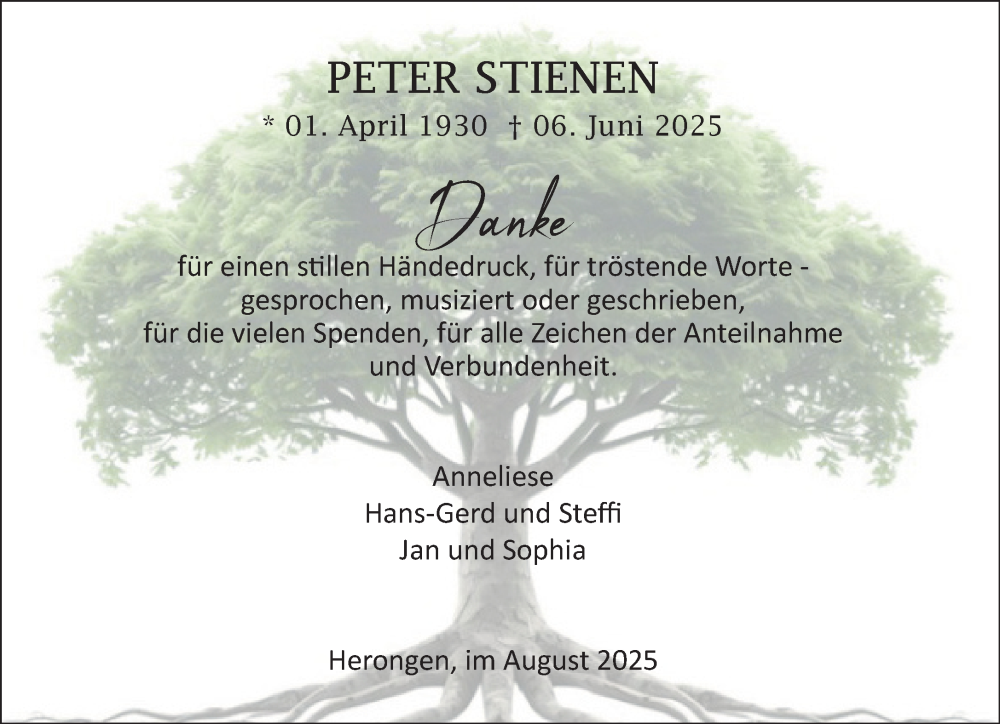 Hier finden Sie alle Traueranzeigen aus der Zeitung, die bisher für Peter Stienen erschienen sind. Weitere Traueranzeigen, die in der Zeitung erscheinen, werden hier ebenfalls aufgelistet