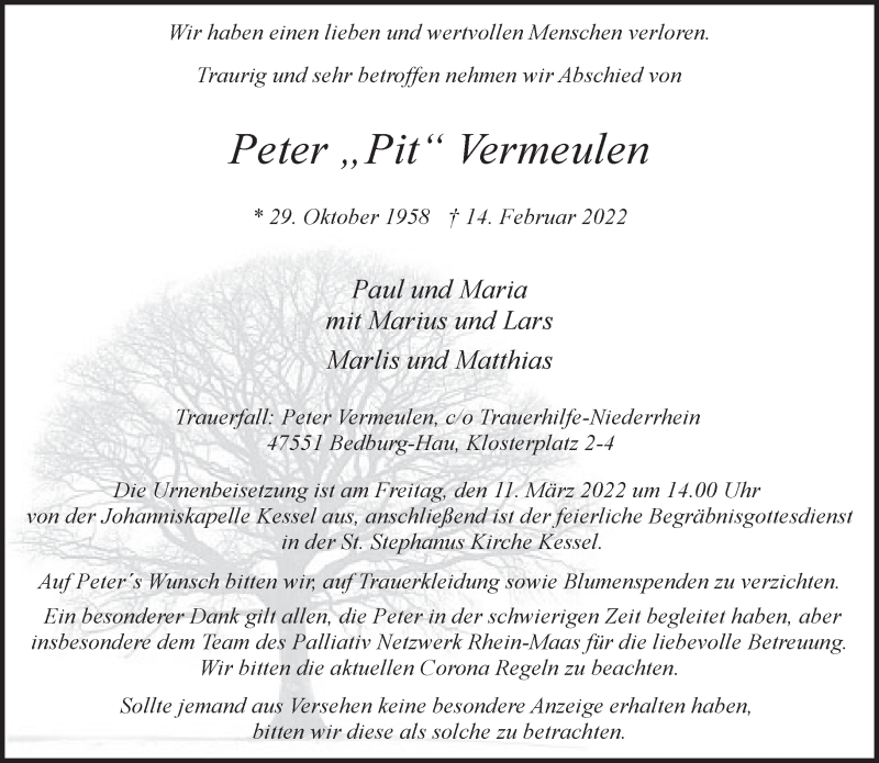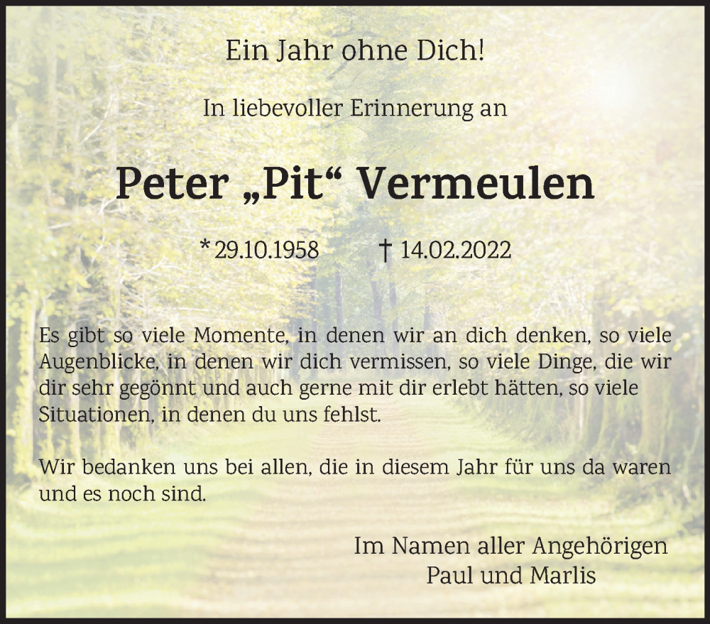 Hier finden Sie alle Traueranzeigen aus der Zeitung, die bisher für Peter Vermeulen erschienen sind. Weitere Traueranzeigen, die in der Zeitung erscheinen, werden hier ebenfalls aufgelistet