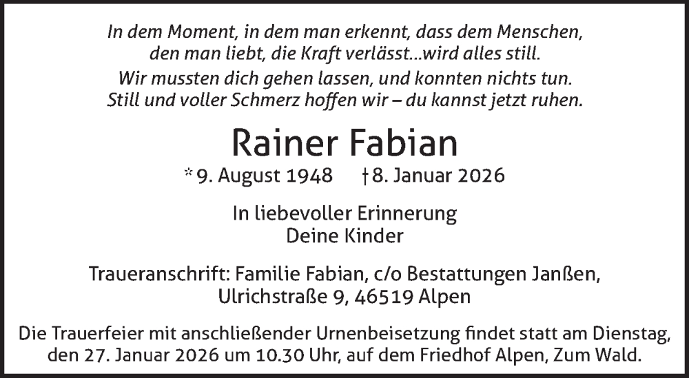 Hier finden Sie alle Traueranzeigen aus der Zeitung, die bisher für Rainer Fabian erschienen sind. Weitere Traueranzeigen, die in der Zeitung erscheinen, werden hier ebenfalls aufgelistet