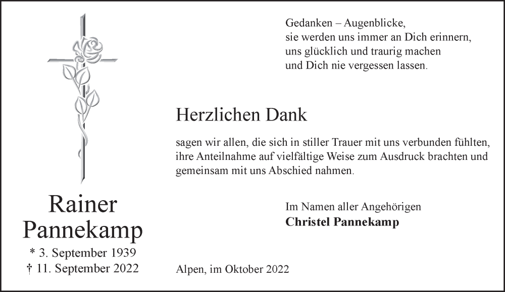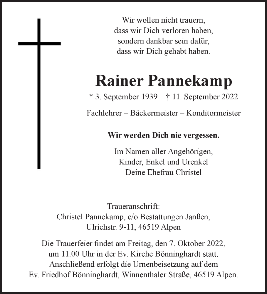Hier finden Sie alle Traueranzeigen aus der Zeitung, die bisher für Rainer Pannekamp erschienen sind. Weitere Traueranzeigen, die in der Zeitung erscheinen, werden hier ebenfalls aufgelistet