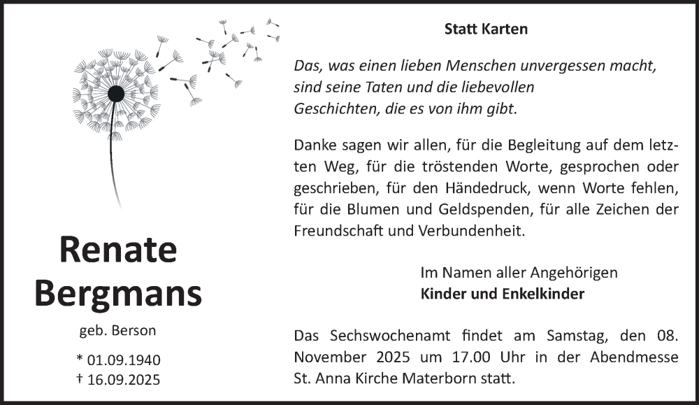 Hier finden Sie alle Traueranzeigen aus der Zeitung, die bisher für Renate Bergmans erschienen sind. Weitere Traueranzeigen, die in der Zeitung erscheinen, werden hier ebenfalls aufgelistet