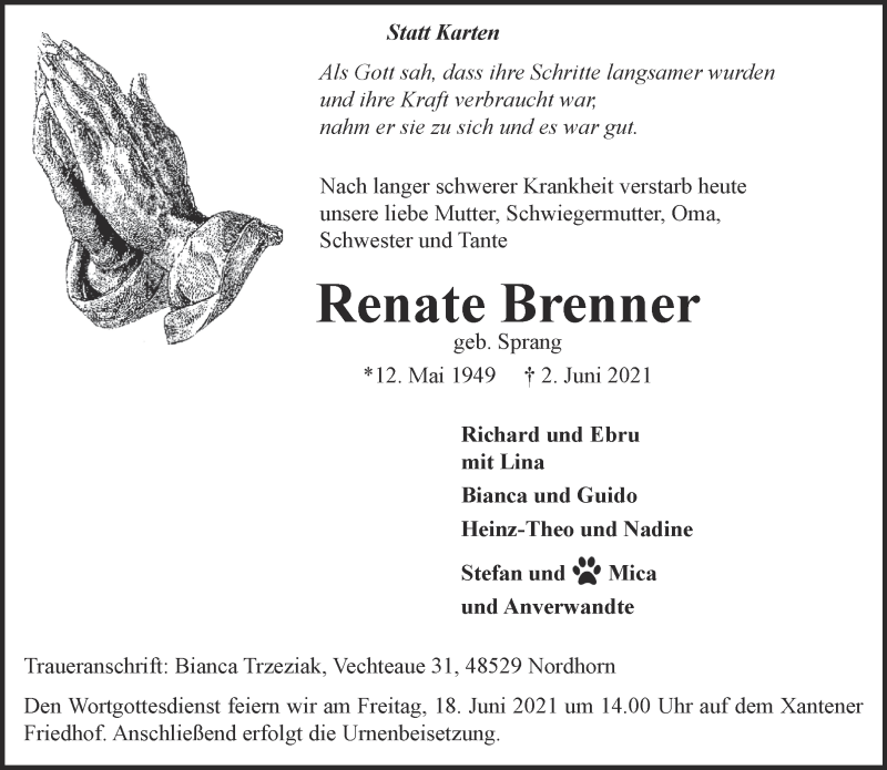 Hier finden Sie alle Traueranzeigen aus der Zeitung, die bisher für Renate Brenner erschienen sind. Weitere Traueranzeigen, die in der Zeitung erscheinen, werden hier ebenfalls aufgelistet