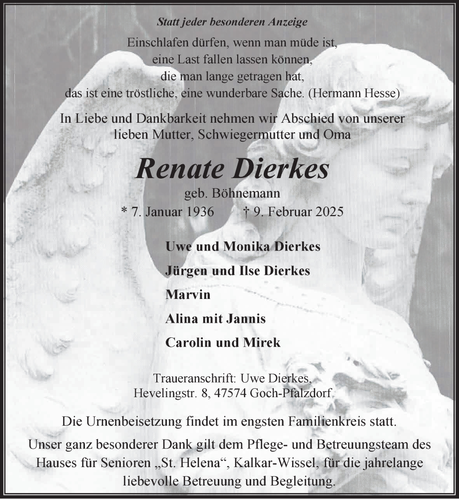 Hier finden Sie alle Traueranzeigen aus der Zeitung, die bisher für Renate Dierkes erschienen sind. Weitere Traueranzeigen, die in der Zeitung erscheinen, werden hier ebenfalls aufgelistet