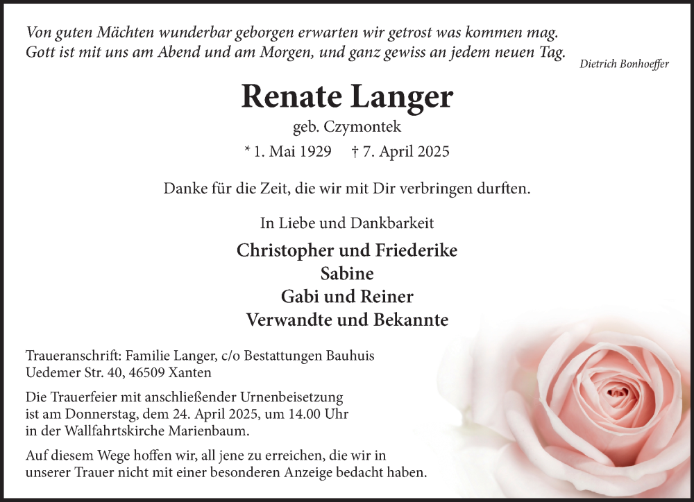Hier finden Sie alle Traueranzeigen aus der Zeitung, die bisher für Renate Langer erschienen sind. Weitere Traueranzeigen, die in der Zeitung erscheinen, werden hier ebenfalls aufgelistet
