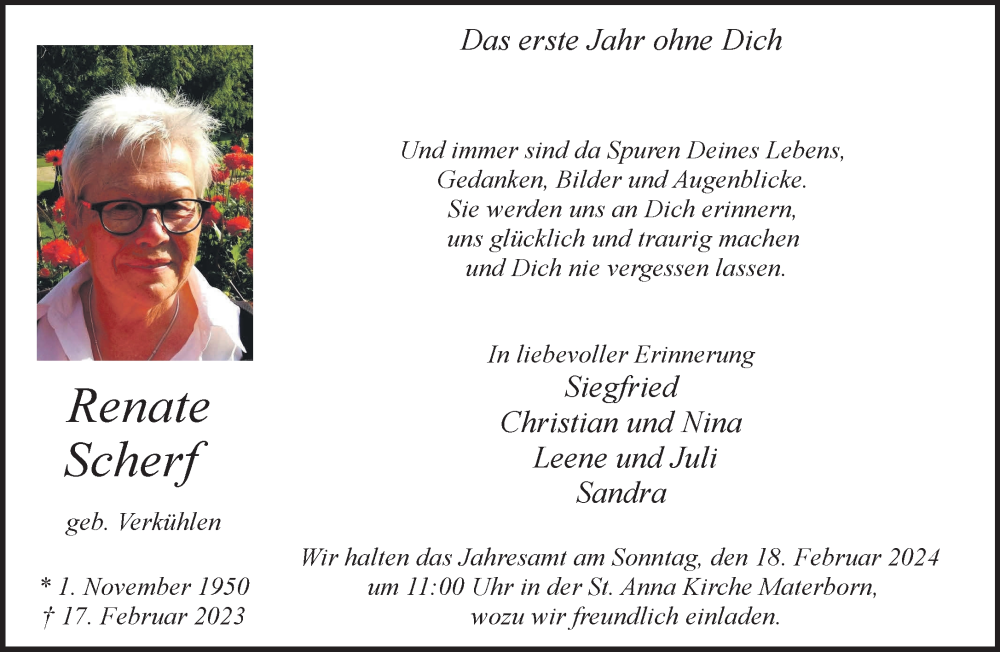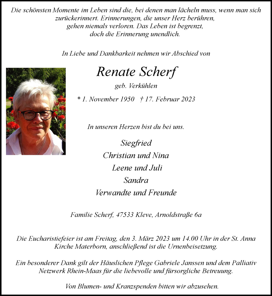 Hier finden Sie alle Traueranzeigen aus der Zeitung, die bisher für Renate Scherf erschienen sind. Weitere Traueranzeigen, die in der Zeitung erscheinen, werden hier ebenfalls aufgelistet