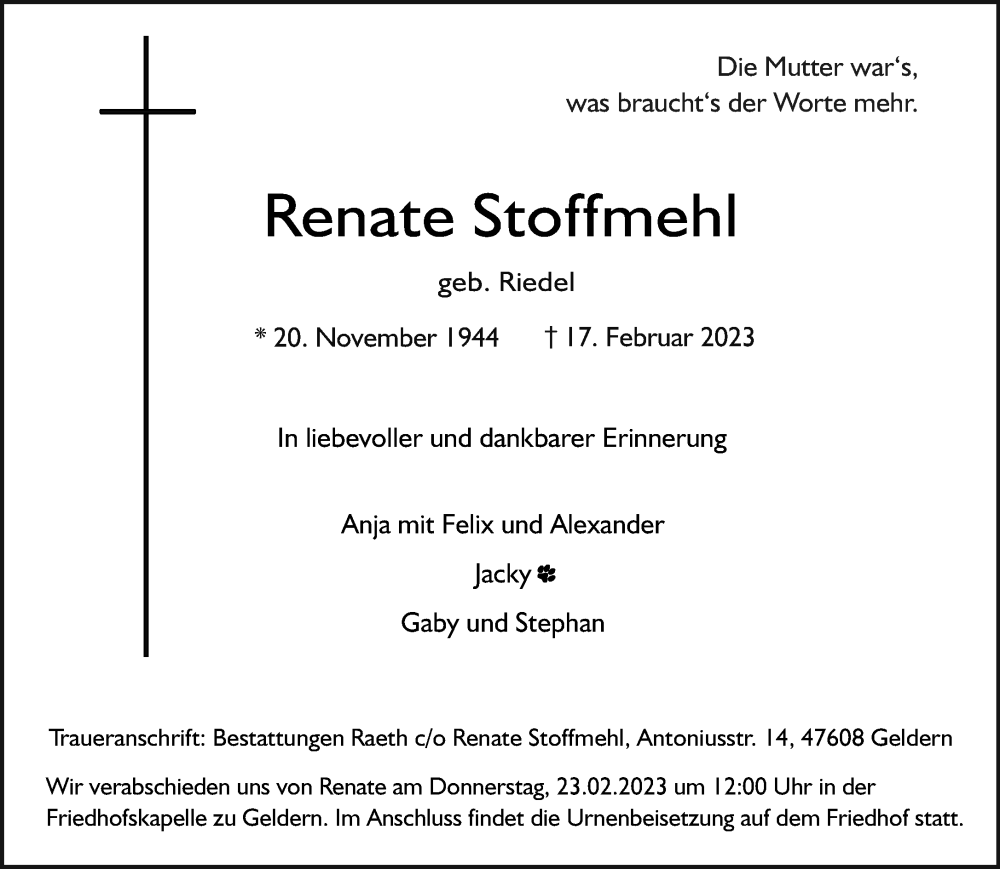 Hier finden Sie alle Traueranzeigen aus der Zeitung, die bisher für Renate Stoffmehl erschienen sind. Weitere Traueranzeigen, die in der Zeitung erscheinen, werden hier ebenfalls aufgelistet