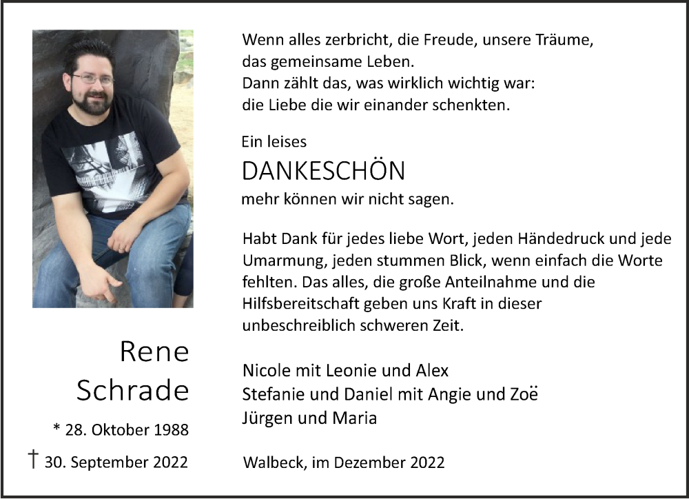 Hier finden Sie alle Traueranzeigen aus der Zeitung, die bisher für Rene Schrade erschienen sind. Weitere Traueranzeigen, die in der Zeitung erscheinen, werden hier ebenfalls aufgelistet