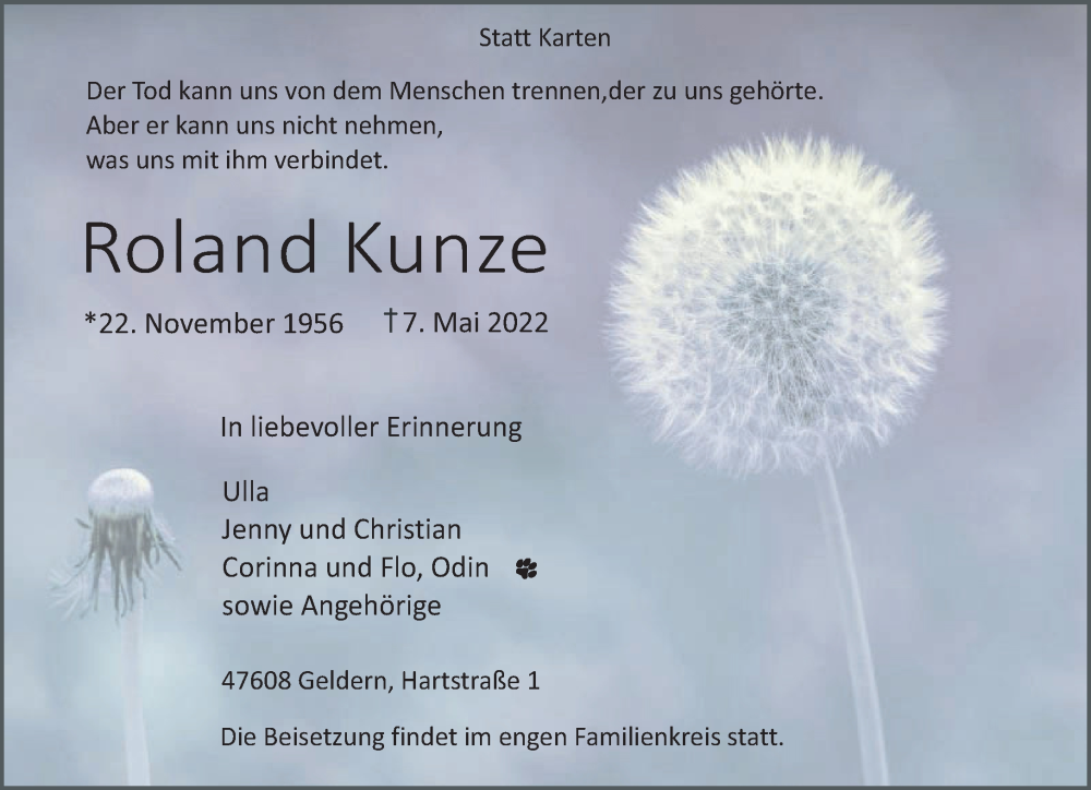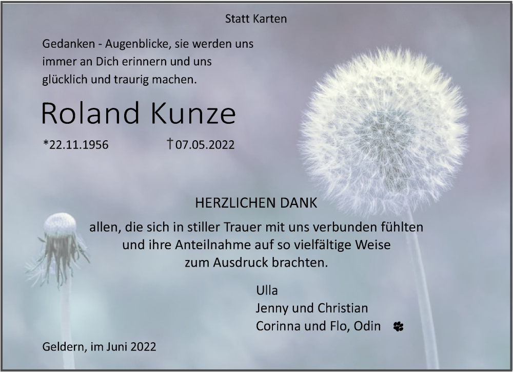 Hier finden Sie alle Traueranzeigen aus der Zeitung, die bisher für Roland Kunze erschienen sind. Weitere Traueranzeigen, die in der Zeitung erscheinen, werden hier ebenfalls aufgelistet