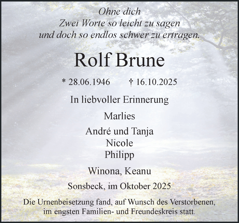 Hier finden Sie alle Traueranzeigen aus der Zeitung, die bisher für Rolf Brune erschienen sind. Weitere Traueranzeigen, die in der Zeitung erscheinen, werden hier ebenfalls aufgelistet