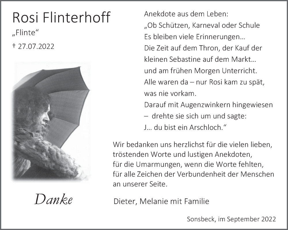 Hier finden Sie alle Traueranzeigen aus der Zeitung, die bisher für Rosi Flinterhoff erschienen sind. Weitere Traueranzeigen, die in der Zeitung erscheinen, werden hier ebenfalls aufgelistet