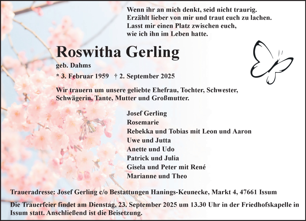 Hier finden Sie alle Traueranzeigen aus der Zeitung, die bisher für Roswitha Gerling erschienen sind. Weitere Traueranzeigen, die in der Zeitung erscheinen, werden hier ebenfalls aufgelistet